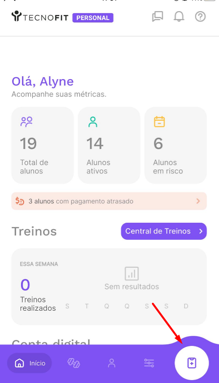 Para começar a prescrever um treino, toque no ícone localizado no canto inferior direito do aplicativo para criar uma nova planilha.