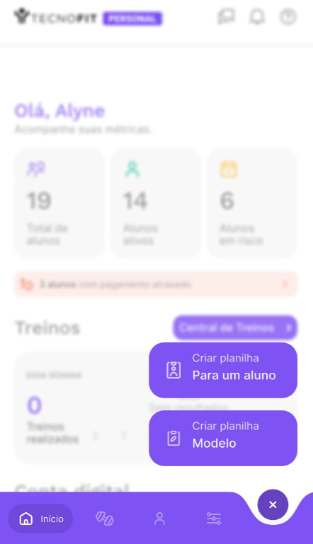No Tecnofit Personal, você pode criar planilhas completas de treino para cada aluno, organizando treinos por grupos musculares, objetivos ou frequência semanal.