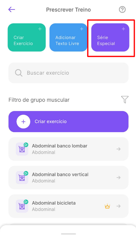 Palavras-chave: prescrição de treino, planilha de treino, criar planilha de treino, adicionar exercícios, bi-set, séries especiais, circuito de treino, drop-set.