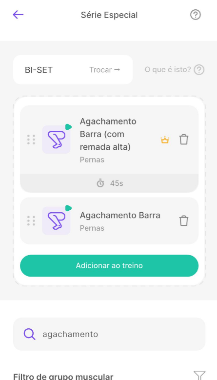 Essa funcionalidade permite criar treinos mais dinâmicos e desafiadores, conforme o objetivo do aluno.