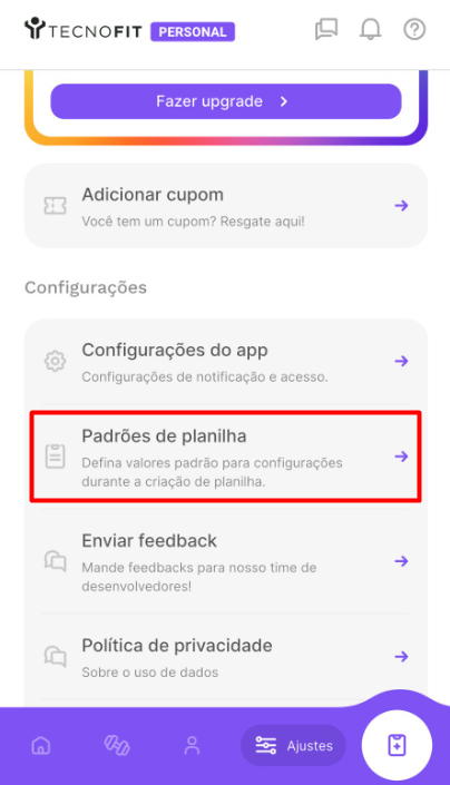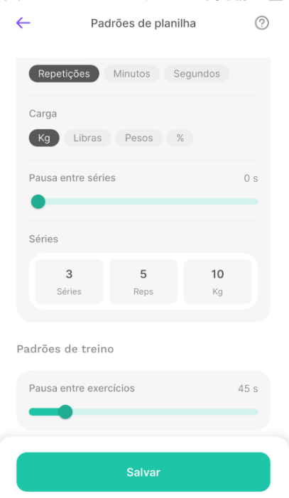 Ao configurar um padrão, todas as novas planilhas de treino serão criadas automaticamente com essas informações — deixando a montagem dos treinos mais rápida e consistente.