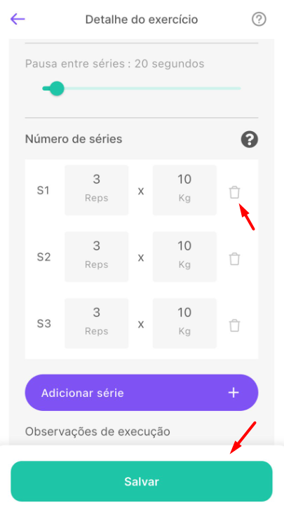 1. Toque no exercício já adicionado ao treino para abrir os detalhes.