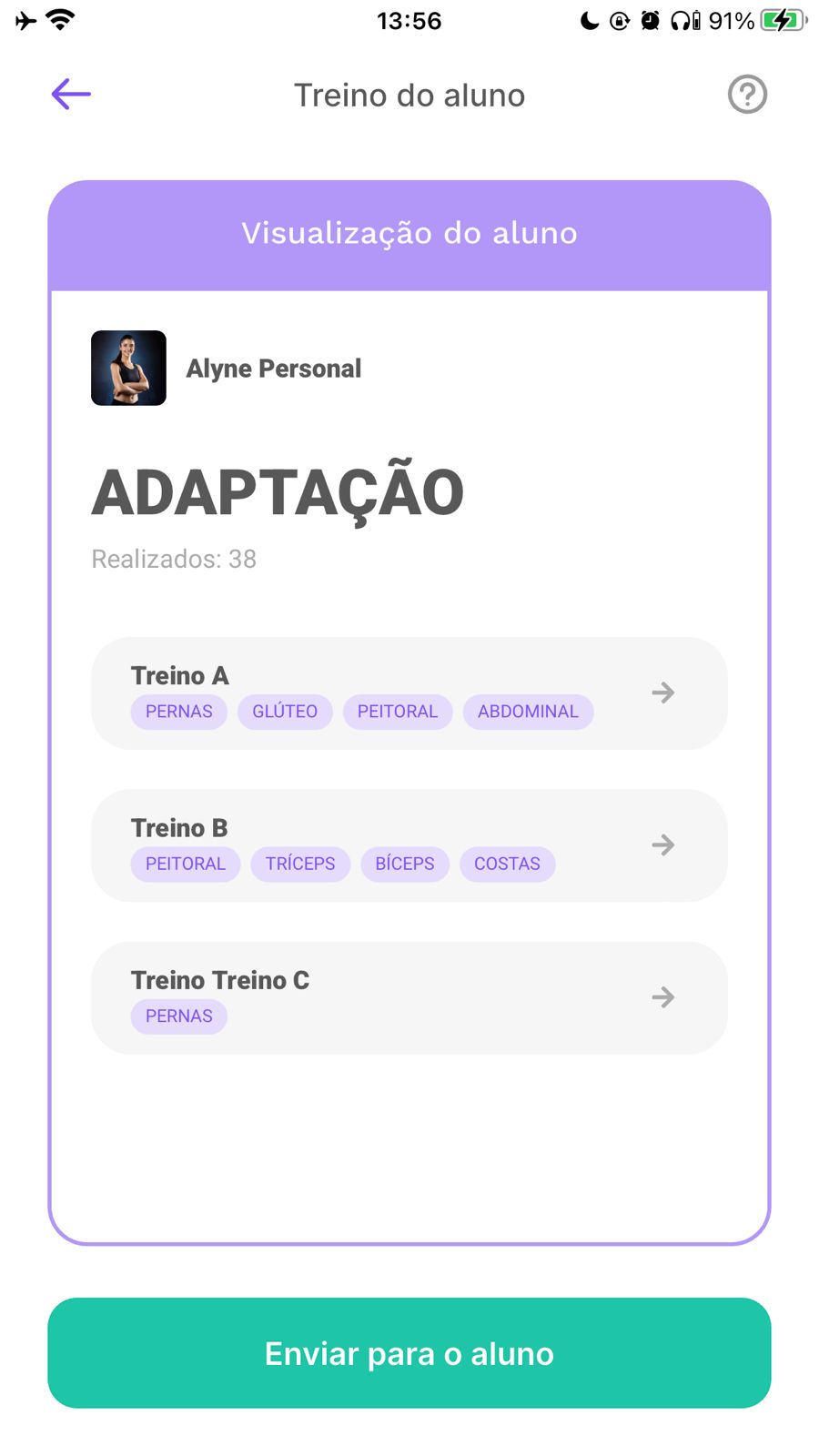 Ao tocar em Visualizar treino do aluno, será exibido: