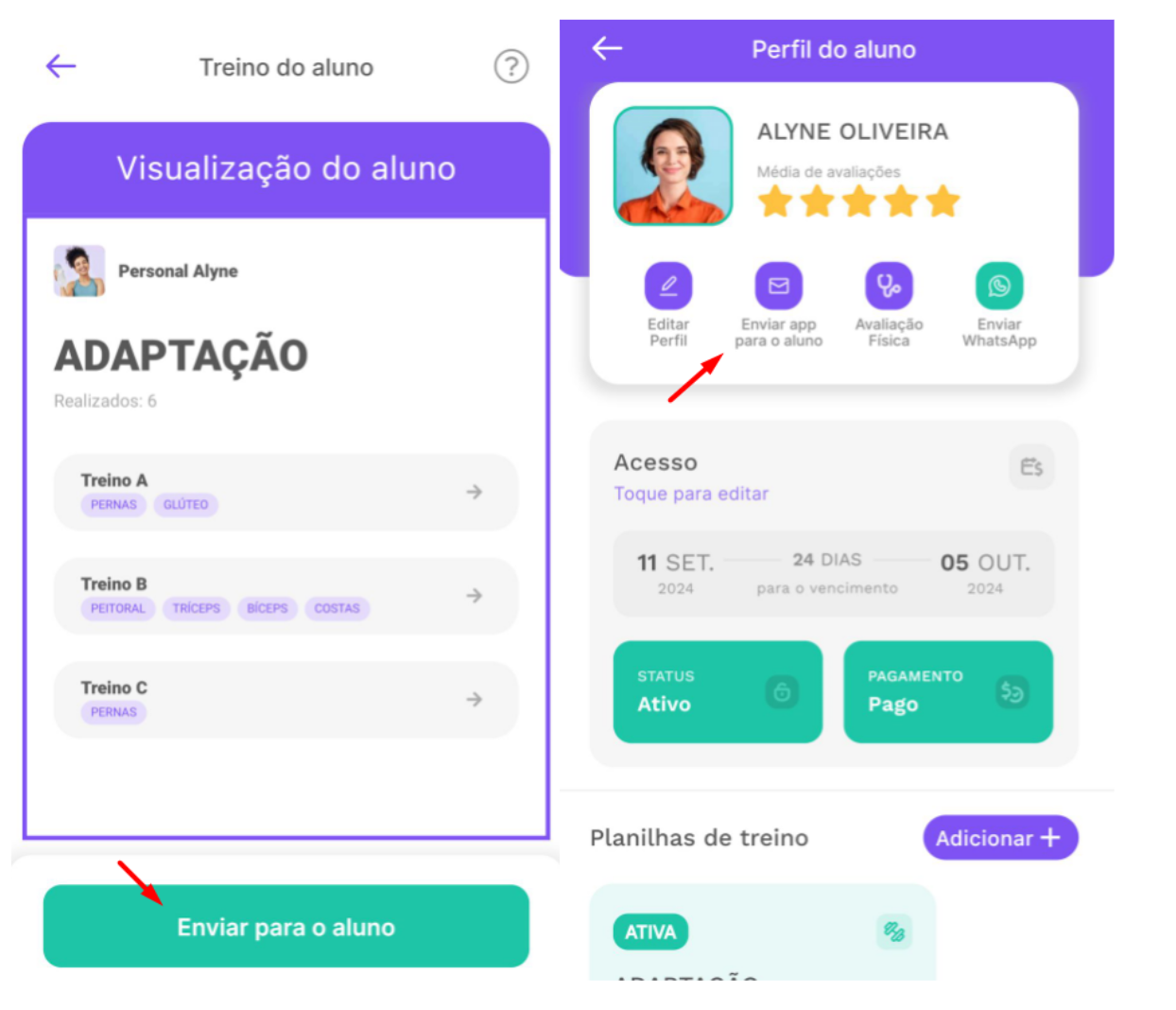 Palavras-chave: acesso do aluno, enviar treino para o aluno, treino do aluno, visualizar treino do aluno