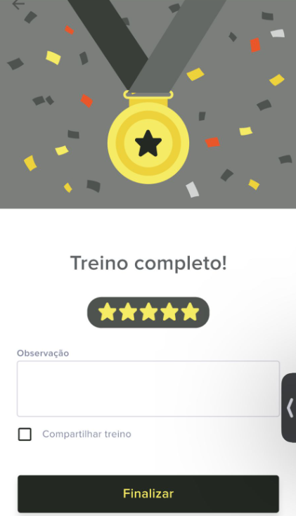 Após cada treino, o aluno pode registrar sua experiência diretamente no aplicativo. A avaliação inclui três elementos principais: